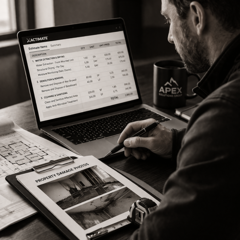 A strong restoration project starts with an accurate and well-supported estimate. Apex Solutions Group delivers detailed estimating services that emphasize precision, transparency, and a clear understanding of project scope from the outset. Our estimating work is backed by a Level 3 Xactimate Certified professional, bringing advanced expertise and a mastery-level understanding of industry-standard estimating practices to every project.